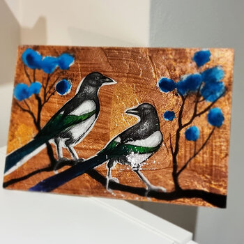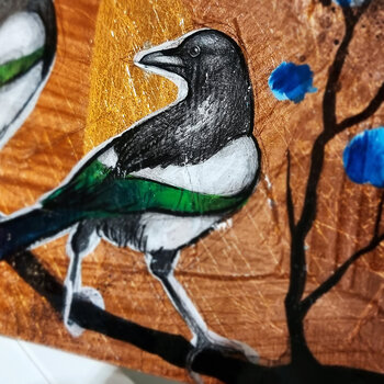 Handübertragener und handbemalter Laserdruck auf Holz, basierend auf dem Originalkunstwerk „Waiting for the Spring XVII“.