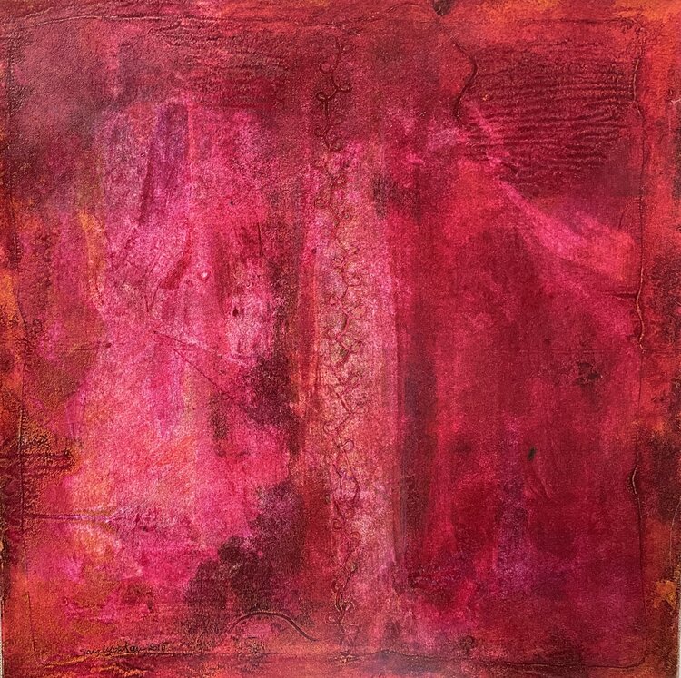 In dieser Arbeit habe ich glühende Leidenschaft und emotionale Tiefe vermittelt, indem ich mit Weichwachs-Gravurtechniken, Monoprint und einem Einzelexemplar-Reliefdruck gearbeitet habe. Die roten Farbtöne rufen Wärme hervor und die weichen Kanten rufen ein Gefühl von Geheimnis hervor. Es ist ein Stück, das Energie und Gedanken in Ihr Zuhause bringt und Gespräche und Selbstbeobachtung anregt.