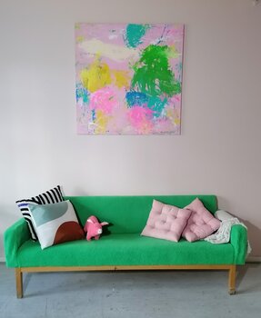 Dieses Gemälde sprüht vor lebendiger Energie und Emotionen durch kräftige Acrylstriche. Ich habe meine Leidenschaft in Schichten aus leuchtenden Grün-, Gelb- und Rosatönen gegossen und so das Chaos und die Harmonie eines wirbelnden Herzens eingefangen. Es ist Ausdruck roher, ungefilterter Gefühle, die jedem Raum eine lebendige, dynamische Atmosphäre verleihen und den Betrachter jedes Mal, wenn er es sieht, dazu einladen, Freude und Bewegung zu spüren.…