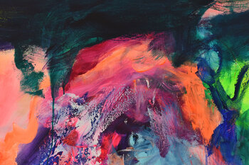 "Floating Feelings" ist ein buntes, abstraktes Acrylgemälde auf Leinwand. Dominiert von Lila im Kontrast zu den warmen Farben Orange, Gelb und Rot. Das Werk ist sehr expressiv und modern und erinnert an Street art. Durch den Kontrast baut der Künstler Sebastian Merk eine Welt mit mehreren Dimensionen auf. Außerdem verwendet der deutsche Künstler Neon Farben. Das Bild leuchtet somit auch im UV Licht und es entsteht eine ganz andere Welt.