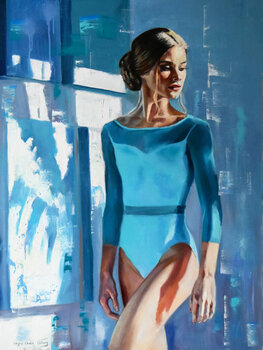 Eine Fortsetzung des Ballettthemas. Ein Ballerina-Porträt im Kontrastlicht. Realistische und zeitgenössische figurative Kunst. Professionelle Farben auf Leinwand.