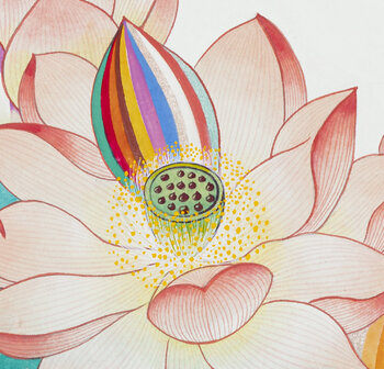 Es sieht aus, als würde eine Lotusblume den runden Mond stützen. Lucky, die beim geheimnisvollen Schlaflied der Lotusblume tief geschlafen hat, befindet sich auf einer langen Reise ins Land der Träume.