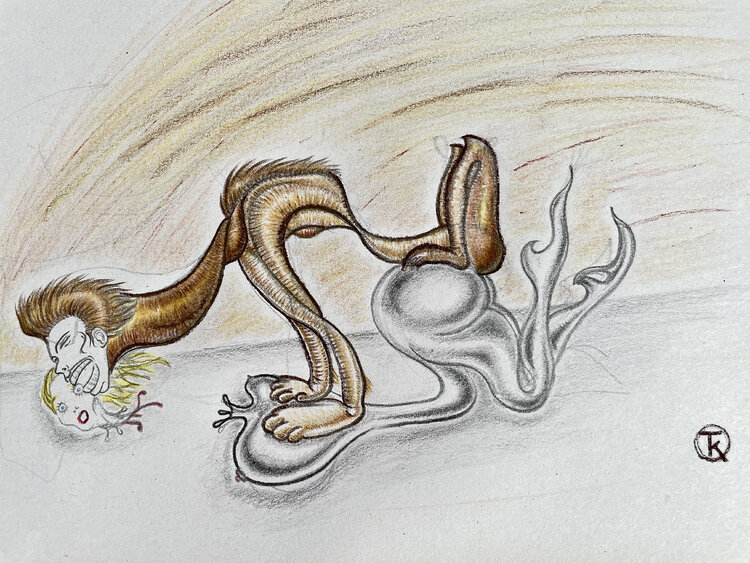 Diese Zeichnung zeugt von der Animalität des Verlangens des anderen, von einer eingewilligten und gewünschten Bestialität. Die Intensität dieser Körperverschmelzung geht durch das Herz. Urteile haben keinen Platz, es ist die Alchemie, die spricht. Dieses Stück lädt uns ein, über die Paradoxien des Menschen nachzudenken, mit einem Hauch von schwarzem Humor, um die Tiefe seiner Botschaft aufzuhellen. Wenn es bei Ihnen zu Hause hängt, verspricht es,… Gespräche anzuregen und das Außergewöhnliche zu genießen, das in den Eigenarten des Menschseins liegt.