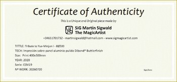 Die COV19-Serie greift klassische Werke erneut auf, fügt ihren Protagonisten die Masken hinzu und gibt sie zurück, um eine Reflexion über den historischen Moment zu eröffnen, den wir erleben. Pantone® direkter hexachromer Druck auf poliertem Aluminiumpanel 400x500mm. Der Druck auf Aluminium verleiht dem Stück einen einzigartigen Charakter und die Helligkeit und Reflexionen lassen es je nach Sichtweise variieren und bieten immer unglaubliche und schöne…