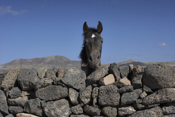 Dieses faszinierende Farbfoto, aufgenommen auf Fuerteventura, zeigt ein Pferd, das neugierig über eine rustikale Vulkansteinmauer blickt. Die raue Schönheit der einsamen Insellandschaft trifft auf den sanften Ausdruck des Tieres, all das unter dem weiten atlantischen Himmel. Die Szene vermittelt Humor, Gelassenheit und die stille Widerstandsfähigkeit des Lebens auf den Kanarischen Inseln.