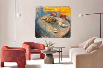 In meiner Arbeit habe ich die Ruhe eines alltäglichen Moments erkundet und ein einfaches Frühstück in ein fast mystisches Erlebnis verwandelt. Die warmen Farben und die realistische, aber symbolische Komposition erzeugen ein Gefühl der Stillstandzeit, des inneren Friedens. Mit Acryl und Emaille wollte ich nicht nur das Licht, sondern auch die spürbare Schwere der Luft einfangen und so ein Fenster in einen Moment aus der Ewigkeit eröffnen. Dieses… Gemälde bringt eine Energie der Gelassenheit und Besinnung mit sich, ideal, um die häusliche Umgebung mit einem Hauch alltäglicher Mystik zu bereichern.