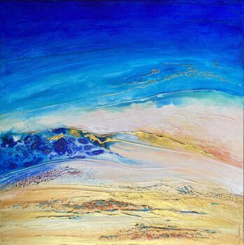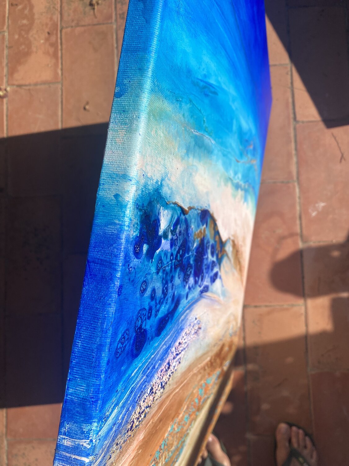 Solar Foam erinnert an die Verschmelzung von Meer und Licht. Durch ein Spiel aus Reliefs, Überlagerungen und verschiedenen Texturen erschuf ich physische Tiefe und luftige Bewegung. Der Vordergrund, hier durch goldene und sandige Akzente dargestellt, erinnert sowohl an die Küste als auch an die Sonnenwärme. Der Kontrast zwischen intensivem Blau und leuchtendem Gold spiegelt die Suche nach dem Gleichgewicht zwischen Frische und Wärme, Schatten und… Licht wider.