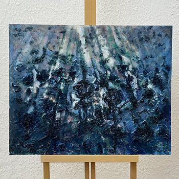 Faszination Unterwasserwelt! Mich gleich einer Nixe schwerelos durch das schummrige Blau bewegen zu können, zwischen hohen, rankenden Wasserpflanzen hindurch zu tauchen und dem Spiel des Sonnenlichts zuzusehen, das in die Tiefen leuchtet, gedämpfte Geräusche, Stille… All diese phantasievollen Träumereien haben mich zu dem Motiv angeregt. Ich habe hier vor der Farbgebung mit Collage (Pappmaschee) gearbeitet um die Struktur der Pflanzen fast greifbar… machen zu können. Dabei ist es kein Zufall, dass die Struktur der Gewächse an Rosen erinnert. Unterwasser-Rosen; eine blauäugige Träumerei. „This must be underwater love“…