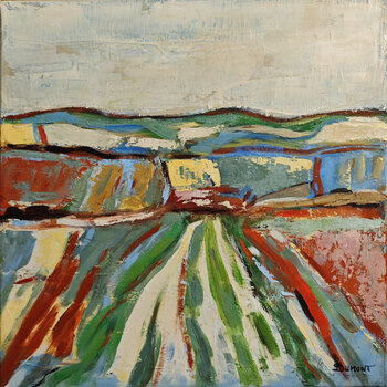 Fields in Motion ist ein Werk von Sophie Dumont, einer zeitgenössischen französischen Malerin, die für ihre stilisierten, an die Abstraktion grenzenden Landschaften bekannt ist. Diese mit kühner Geste in Öl auf Leinwand gemalte Komposition erforscht die Spannung zwischen räumlicher Konstruktion und bildlicher Spontaneität.