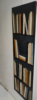 In „Chronicles of the Spirit“ lädt uns Sophie Dumont zu einer subtilen Erkundung von Linien und Volumen durch die Kunst der Ölmalerei ein. Dieses 150 x 50 cm große Werk ist Teil eines zeitgenössischen Ansatzes, bei dem die Beherrschung von Textur und Farbe von wesentlicher Bedeutung ist. Auf den ersten Blick scheint das Werk durch die Darstellung von Büchern, einer Metapher für Wissen und gesammelte Weisheit, die Essenz von Reflexion, Intellekt und… Immateriellem einzufangen.