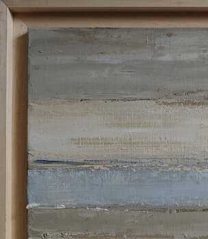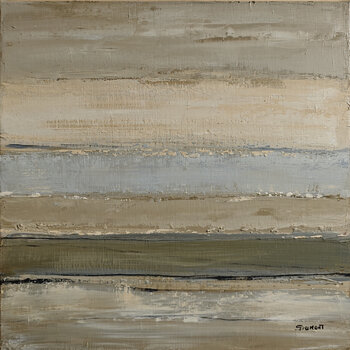 Dieses zeitgenössische Gemälde mit seinen sanften, natürlichen Farbtönen erinnert durch eine horizontale Abstraktion mit klaren Linien an eine Küstenlandschaft. Die mit einem Spachtel bearbeitete, reich strukturierte Oberfläche verleiht Licht, Sand und Seeluft eine physische Präsenz.