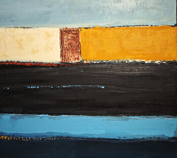 Dieses in Öl und mit Spachtel auf Leinen gemalte Gemälde entfaltet eine Symphonie horizontaler Linien, die den Betrachter zu einer inneren Reise einlädt. Die Komposition zeichnet sich durch Farbschichten aus, die von intensivem Schwarz bis zu tiefem Blau reichen und einen Hauch von Ocker und Terrakotta enthalten, der eine abstrakte Vision des Horizonts hervorzurufen scheint.