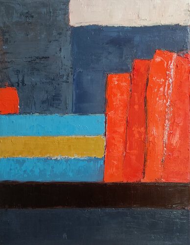 Abstraktes Ölgemälde auf Leinen mit roten Büchern, präsentiert in einer Bibliothek mit blauem und grauem Hintergrund.