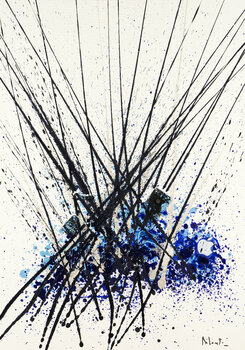Meine Arbeit stellt eine Explosion der Kreativität dar, eine Hommage an die Innovation. Ich habe Acrylfarben und Objekte verwendet, um diese Leinwand zum Leben zu erwecken und Chaos und Ordnung zu mischen. Die Dynamik von Schwarz und Blau setzt Energie frei, während die zurückweichenden Linien einen Schwung in die Zukunft einfangen, ganz als Hommage an die zeitlose Vision. Jeder Betrachter wird in eine lebendige visuelle Symphonie eintauchen und… so einen Hauch von Inspiration in seinen Raum bringen.