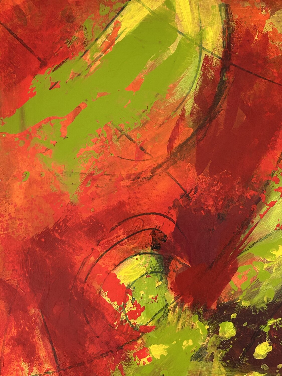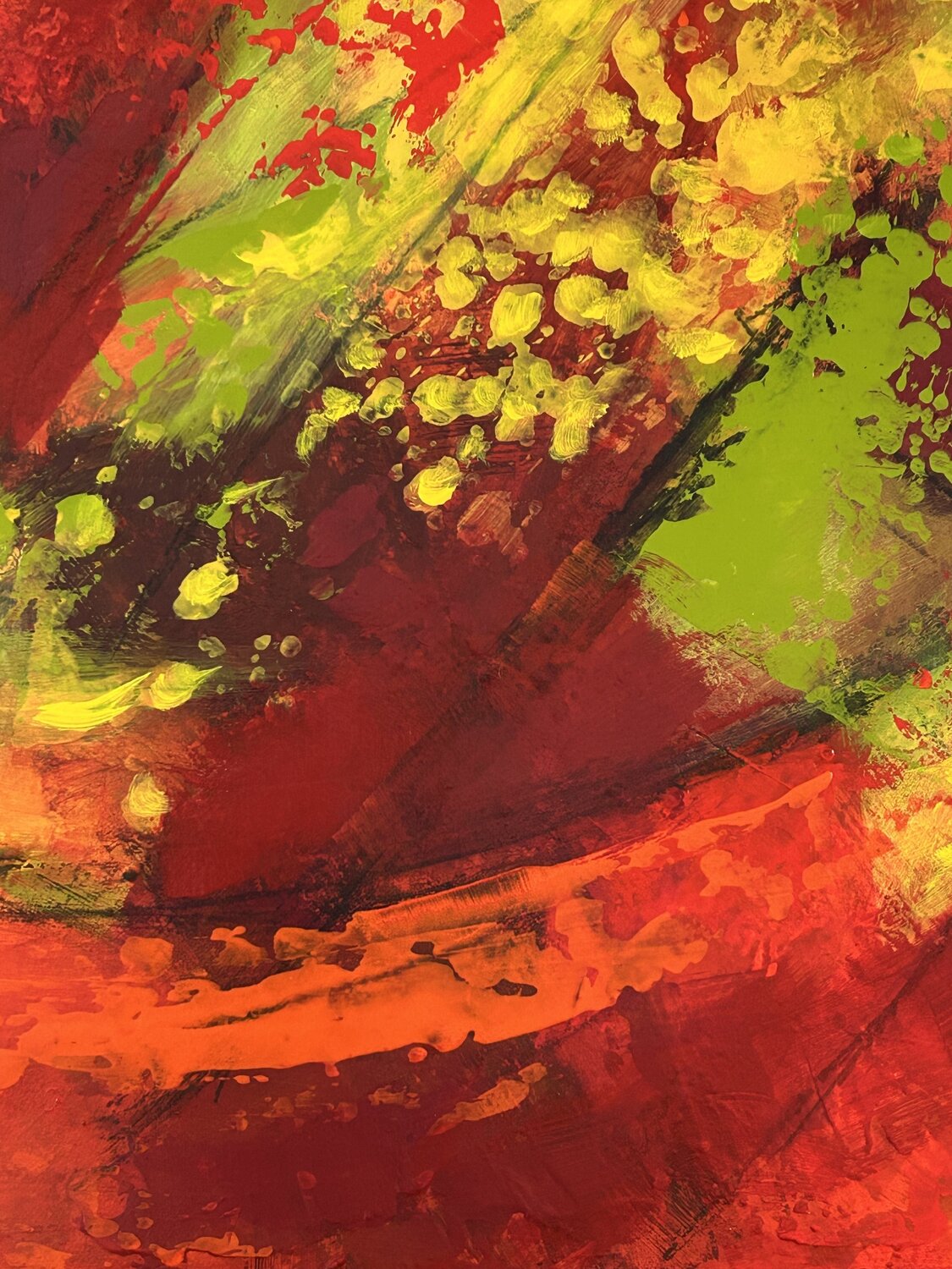 In diesem Werk habe ich die leidenschaftliche Energie des Herbstes eingefangen – die intensiven Rottöne und lebendigen Gelb- und Grüntöne verschmelzen in einem abstrakten Tanz. Mit Acryl und Kohle habe ich Gefühle von Wärme und Veränderung erzeugt, die jeden Raum mit Lebendigkeit und Kraft erfüllen. Dieses Bild bringt dynamische Bewegung und emotionale Tiefe in Ihr Zuhause.