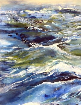 Eine Serie mit Wasserbildern – das klingt so harmlos, aber was uns hier entgegentritt, ist eine aufgewühlte See, ein gewaltiger Strom, der sich kraftvoll seinen Weg durch die Landschaft bahnt. Ihre zum Teil großformatigen Acrylbilder sind keine naturalistischen Darstellungen dessen, was die Künstlerin sieht, sondern drücken vielmehr ihre Wirkung auf die eigenen Empfindungen aus. Expressiv und bewegt – das sind wohl die Adjektive, die ihre Arbeiten… am besten beschreiben. Sei es die aufbrausende Gischt, die Felsen umspült, seien es die Steine selbst, die von innen zu glühen scheinen. Rhythmus und Bewegung, vielleicht auch eine Fähigkeit aus ihrer Zeit als Tänzerin, machen die Bilder spannend und ziehen die Betrachter in ihren Bann....