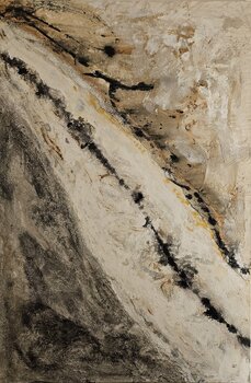 "Die Streif" ist ein großes, ausdrucksstarkes und warmes Werk. Eine bewusst durch Steinmehl und Sand hergestellte Struktur verleiht dem Gemälde eine Tiefe und wirkt sehr harmonisch. Die natürlich gehaltenen Farben sind Schwarz, Weiß, Beige, Creme, Gold und Braun.