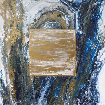 Ein abstraktes Werk in fließender Acryltechnik, das auf dem Kontrast von Tiefe und Licht basiert. Um ein zentrales sandgoldenes Rechteck entfaltet sich ein dynamischer Fluss aus blau-türkisen, graphitfarbenen und weißen Schichten. Transparente „Wellen“, marmorierte Adern und die charakteristischen Zellstrukturen der Fluid Art erzeugen Bewegung und Energie, als ob sich die Oberfläche in mehrere Ebenen gleichzeitig öffnet. Warme Goldakzente mildern… die kühle Farbpalette und verleihen ihr einen inneren Glanz, während das Zentrum als visueller Ruhepunkt und Gleichgewichtspunkt fungiert.