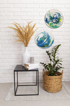 Die beiden Leinwände ergänzen sich in… einem fließenden Übergang und machen das Kunstwerk zu einem ausdrucksstarken Blickfang. Es verleiht jedem Raum eine ruhige und zugleich dynamische Atmosphäre und erinnert an die Gelassenheit der Meereswellen und die Schönheit der Natur in Bewegung.