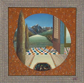 In diesem Werk, das von Aubusson-Wandteppichen inspiriert ist, vergrößert der runde Rahmen die surrealen und ornamentalen Details einer Naturlandschaft.