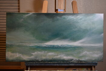 Ruhiges Wasser, ein stimmungsvoller Himmel und tosende Wellen ziehen Sie in dieses Stück. Es regnet am Horizont und begrüßt das wechselnde Wetter.