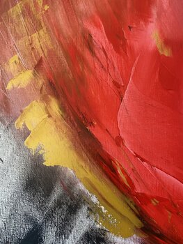 Dieses abstrakte Ölgemälde spielt mit kraftvollen Kontrasten und offenen Bedeutungen. Auf einem schwarz-weißen Boden erhebt sich ein Himmel in zartem Weiß und Rosa – eine friedliche Szene, die von einer glühenden roten und goldenen Flamme durchbrochen wird. Ist es ein Sonnenuntergang oder ein neuer Morgen? Eine brennende Brücke, die endgültig die Vergangenheit von der Zukunft trennt? Oder ein Komet, der im freien Fall verglüht?