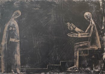 Dann gibt es dennoch eine Lösung, denn der Künstler arbeitet auch auf Kommission. Er kann stilistische Elemente, die Ihnen gefallen, in einem für Sie kreierten Werk einfließen lassen. Sie können dabei die Dimensionen bestimmen und wir verhandeln den Preis für Sie.