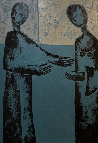 Er und sie haben sich vor langer Zeit getroffen. Sie haben sich geliebt. Er nahm ihre Hände und verließ sie nie wieder. Dies ist eine Liebesgeschichte, bei der ich stilisierte Figuren gezeichnet und die Farben gelöscht habe. Ich suche das Gefühl. Reine Liebe. Alle Figuren in meinen Bildern sind stark stilisiert. Ich verwende mehrere Farbschichten, die die tiefe Textur ergeben