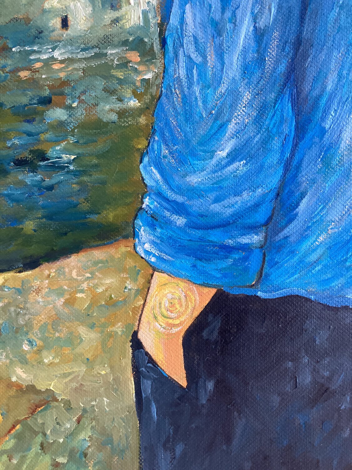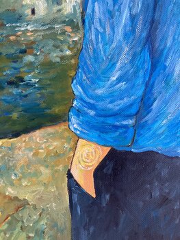 Die erste Malschicht entstand in Acryl, was die spätere Ölmalerei in ihrer Leuchtkraft und Tiefe unterstützt. Die leuchtende Farbpalette, die schwungvollen Pinselstriche und die harmonische Komposition verbinden persönliche Introspektion mit kunsthistorischem Dialog. Das Gemälde verortet sich buchstäblich in einem Klassiker der Kunstgeschichte und lädt die Betrachtenden ein, in diese poetische Verbindung zwischen Vergangenheit und Gegenwart einzutauchen.