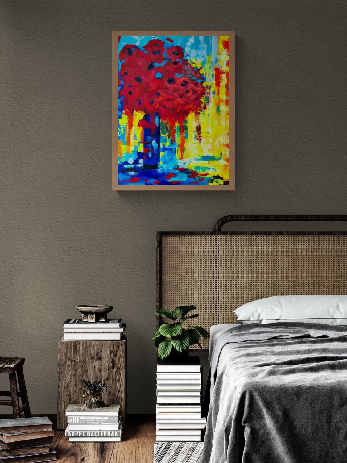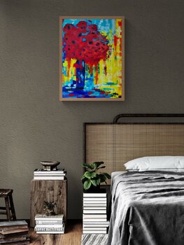 „Abstrakte rote Blumen“ (2025) ist eine kraftvolle, energiegeladene Explosion von Primärfarben. Dieses Original-Ölgemälde auf Leinwand (60 x 80 cm) dekonstruiert das traditionelle Blumenstillleben zu einer dynamischen Komposition aus roher Emotion und Farbe.