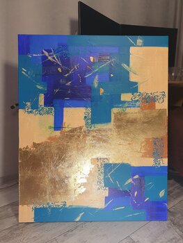 „Blue and Gold Harmony“ ist ein Ölgemälde auf Leinwand (2020, 80 x 100 cm). Dieses großformatige abstrakte Gemälde erkundet den Dialog zwischen tiefem Kobaltblau und strahlendem Gold. Schichten strukturierter Pinselstriche, zarte dekorative Akzente und schimmernde Glanzlichter erzeugen ein Gefühl der Balance zwischen Bewegung und Stille. Die Komposition evoziert sowohl architektonische Ordnung als auch organische Spontaneität und ist damit ein vielseitiges… Werk für die Kontemplation und moderne Innenräume.