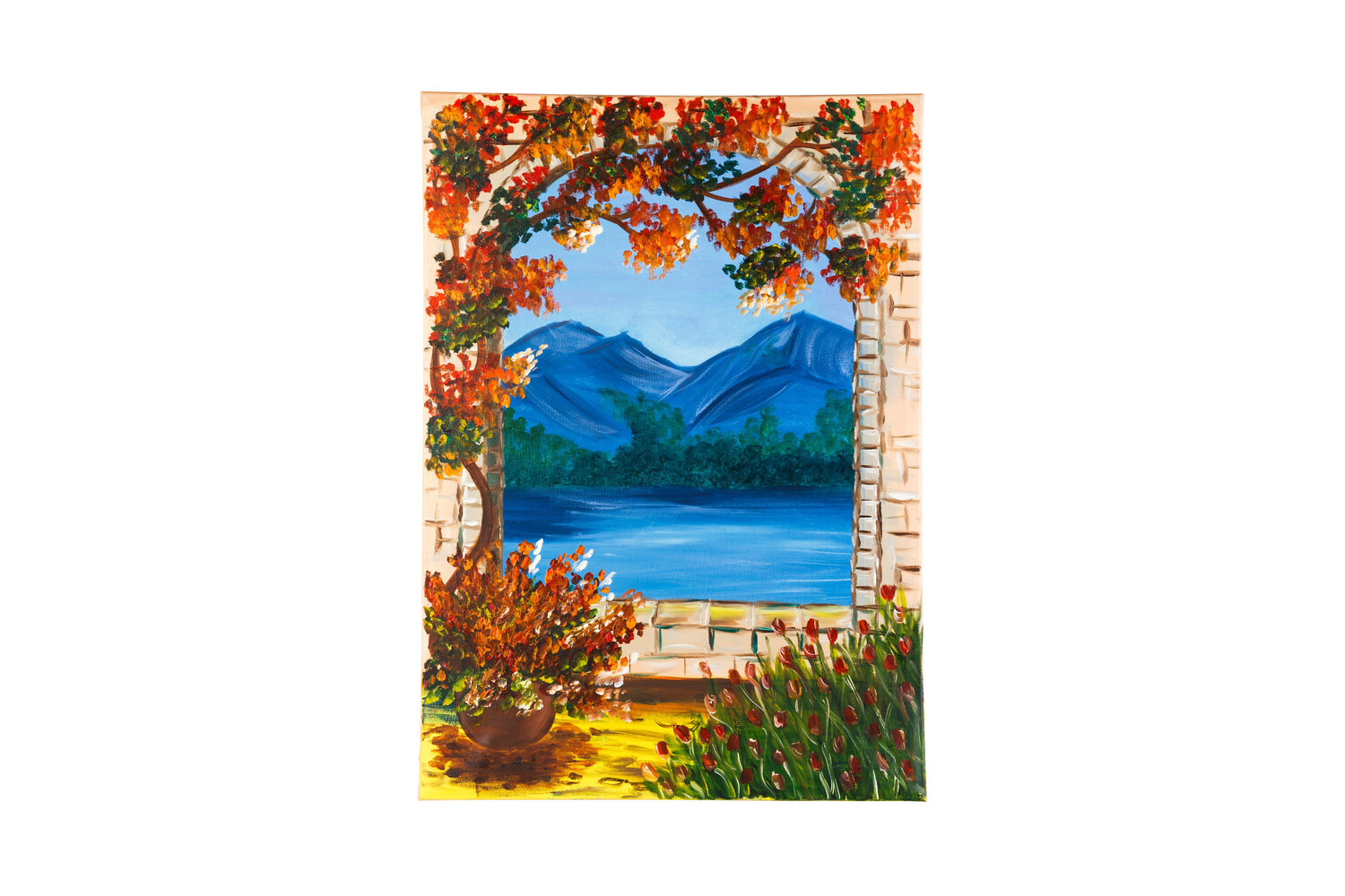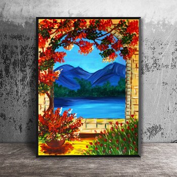 Dieses lebendige Originalgemälde lädt den Betrachter durch einen sonnenbeschienenen Steinbogen in eine Welt stiller Schönheit ein. Der markante Kontrast zwischen der feuerroten Flora und den ruhigen, tiefblauen Bergen erzeugt ein Gefühl leidenschaftlicher Energie, die von tiefem Frieden ausgeglichen wird und den Betrachter sofort in ihren Bann zieht.