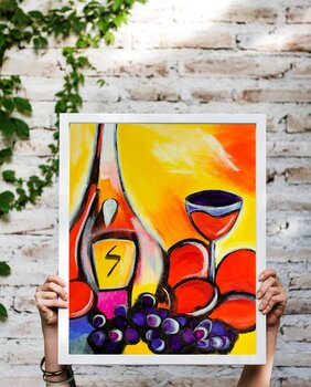 „Goldene Weinstunde“ (2022) ist eine strahlende, modernistische Neuinterpretation des klassischen Stilllebens. Dieses Original-Ölgemälde auf Leinwand (40 x 50 cm) verwandelt ein traditionelles Sujet in ein geometrisches Fest aus Farbe und Licht. Im Zentrum der Komposition stehen eine stilisierte Weinflasche und ein Glas mit tiefrotem Jahrgangswein, vor einem leuchtenden Hintergrund aus sonnigen Gelb- und warmen Orangetönen, die die intensive Hitze… eines mediterranen Nachmittags heraufbeschwören.