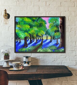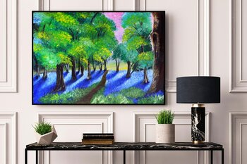 „Sonniger Glockenblumenwald“ (2017) fängt die friedvolle Magie eines Waldspaziergangs im späten Frühling ein. Dieses Original-Ölgemälde auf Leinwand (50 x 70 cm) lädt den Betrachter ein, einem gewundenen Pfad zu folgen, der in der einladenden Tiefe der Bäume verschwindet.