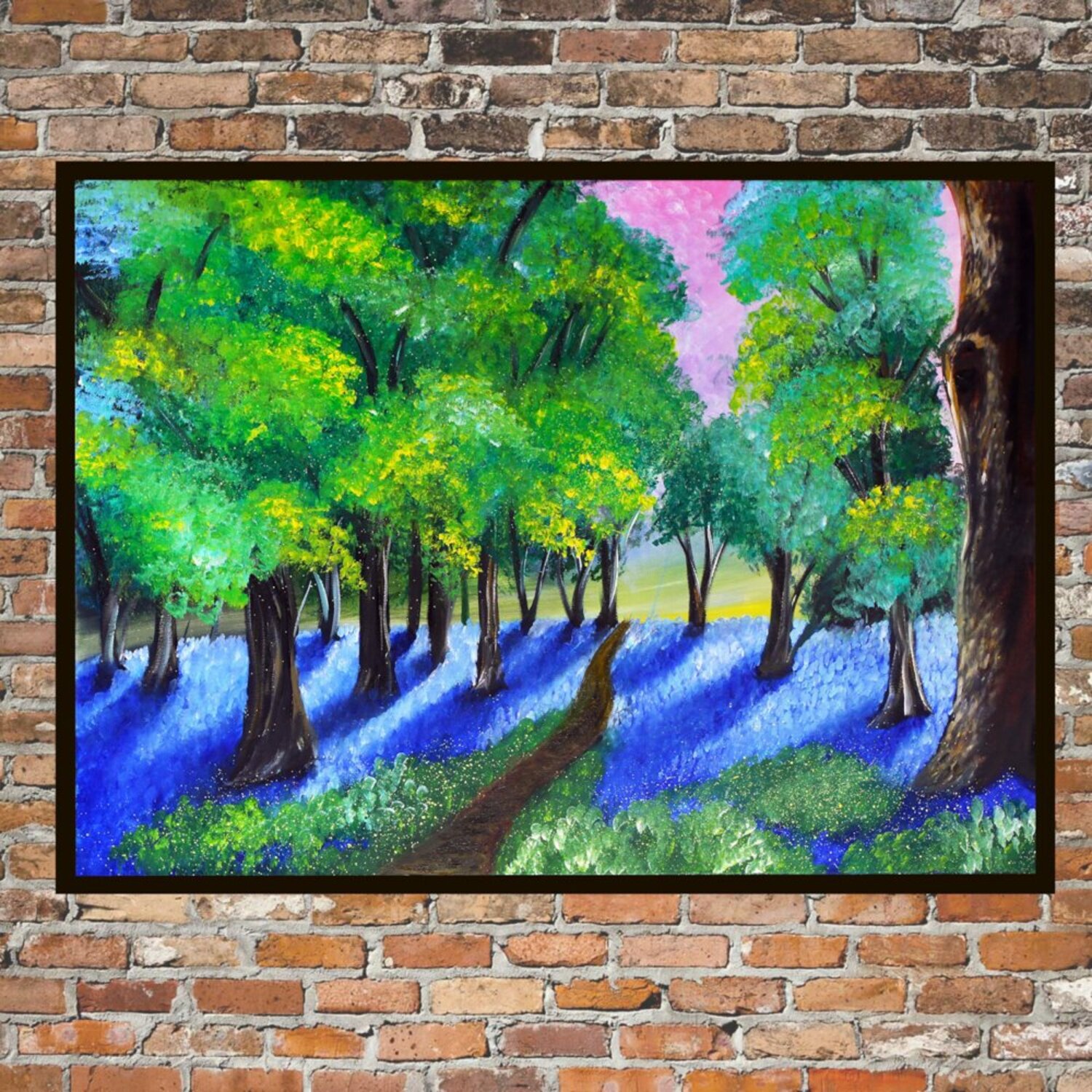 Die Komposition zeichnet sich durch den lebhaften Kontrast zwischen dem Blätterdach und dem Waldboden aus. Der obere Bereich präsentiert sich mit üppigem, strukturiertem Laub… in verschiedenen Frühlingsgrün- und Gelbtönen, das an helles Sonnenlicht erinnert, das durch die Blätter fällt. Darunter erstrahlt der Boden in einem Meer aus tiefem Blau und Violett, das an einen dichten Teppich aus Glockenblumen oder die kühlen, langen Schatten der Bäume erinnert. Ein warmer, brauner Pfad durchzieht das Bild und lenkt den Blick zum Licht in der Ferne.