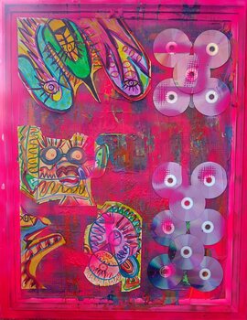 Fuchsia dominiert die Komposition und strahlt Lebendigkeit und Intensität aus, während von Picasso inspirierte Aquarellfragmente und CD-Stücke für Textur, Glanz und Dynamik sorgen. Jede Schicht und jeder… Pinselstrich spiegelt Bewegung und Spontaneität wider und schafft so ein Werk, das entrückt, modern und leuchtend wirkt.