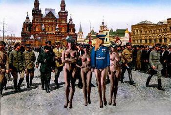 Meine Naked NEW-ton Fotomontagen sind humorvoll und satirisch und kommentieren gleichzeitig die aktuelle globale Situation. Aus diesem Grund habe ich mehr oder weniger dieselbe Gruppe von gleichgültigen nackten Modellen verwendet, um den Menschen darzustellen, wie wir nackt von Geburt an nackt im Tod sind. Alles andere sind Kosmetik und Uniformen. Durch die Verwendung der gleichen Helmut Newton-Mädchen, aber in verschiedenen historischen Landschaften… und immer wieder wiederholenden Saum, wie Andy Warhol es getan hat, um Supermarktprodukte zu simulieren, die für den Massenkonsum bestimmt sind, warne ich davor, dass wir alle immer mehr von denen manipuliert werden Energie.