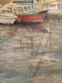 Ich habe die Ruhe der Morgendämmerung eingefangen, mit Booten, die sich sanft vor goldenen und blauen Reflexen wiegen. Jeder Pinselstrich in Acryl und Öl bringt meine Leidenschaft zum Ausdruck, die Essenz des Hafens einzufangen und Impressionismus und Realismus zu vereinen. Dieses Werk ist eine Oase des Friedens, die jedem Raum die Ruhe des Meeres verleiht.