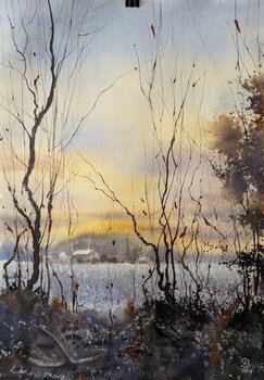 In diesem Gemälde wollte ich die stille, besinnliche Atmosphäre eines Wintermorgens einfangen. Mit zarten Aquarellstrichen habe ich die zerbrechliche Schönheit kahler Äste vor einem sanft leuchtenden Himmel zum Ausdruck gebracht. Der impressionistische Stil lädt den Betrachter ein, die Stille und die subtile Wärme der kalten Luft zu spüren und jedem Raum, in dem das Bild hängt, eine sanfte, friedvolle Energie zu verleihen.
