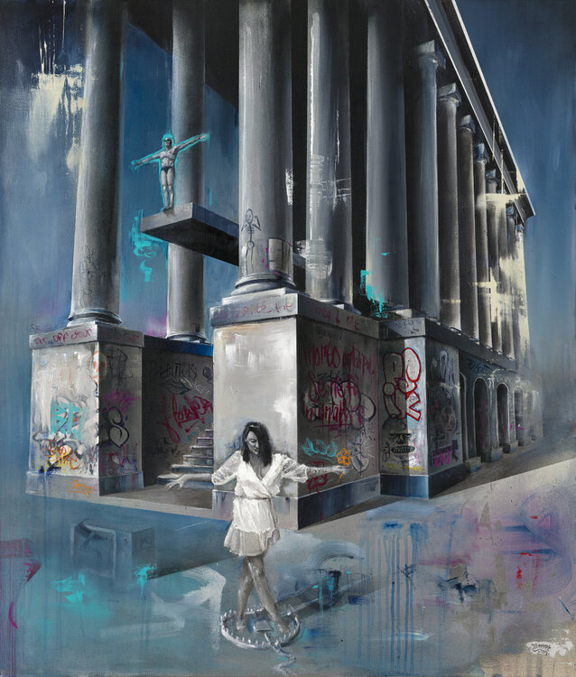 Tommy Fiendish, Absolvent des Masterstudiengangs Malerei am Royal College of Art und hervorgegangen aus der Underground-Kreativszene, erschafft magische Welten urbanen Surrealismus und verfallenen Luxus. Mit einem Hintergrund in Tätowierung, Schildergestaltung und elektronischer Musikproduktion kombiniert Fiendish metaphorische Bildsprache und kühne Architekturlandschaften in Öl auf Leinwand und deutet so eine moderne Welt mit metaphorischer Satire an. Er schafft eindrucksvolle, kühne und wunderschöne Werke von Eleganz und Schärfe zugleich. Seine Arbeiten sind auch ein Hauptmerkmal des EA-Spieleklassikers Need For Speed Heat für die PlayStation.