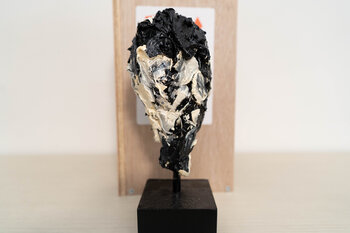 Diese Skulptur ist ein Tanz der Kontraste, geformt von meinen Händen in einem Nebeneinander rauer und glatter Texturen, eine monochrome Palette, die Leben einhaucht. Ich habe Emotionen mit Acryl… und Ton in Form gebracht, wobei Edelstahl für seine Stärke und Papier für seine Zerbrechlichkeit sorgte. Ich habe dies so gestaltet, dass es zum Nachdenken anregt, um als rätselhafte Präsenz in Ihrem Raum zu stehen und ihn mit einer stillen, aber dennoch tiefgründigen Erzählung von Widerstandsfähigkeit und Tiefe zu beleben.