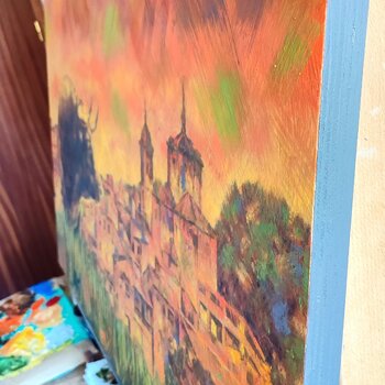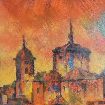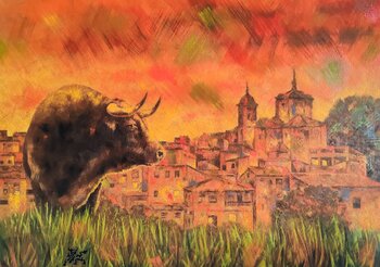 Mit Ölfarbe und einer Mischung aus Expressionismus und Impressionismus habe ich die Stärke und das lebendige Wesen des Stiers vor dem Sonnenuntergang im Dorf eingefangen.