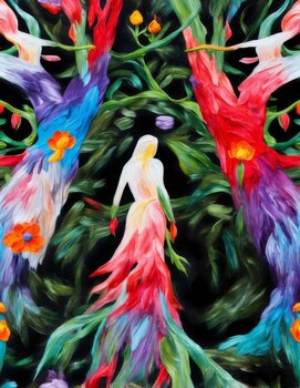 In diesem Werk entsteht eine Figur, als sei sie aus dem Gewebe der Natur selbst geboren: Blütenblätter, Blätter und Zweige verweben sich zu einer Form. Der Körper löst sich in einer fließenden Farbkaskade auf, die Zerbrechlichkeit und Stärke, Vergänglichkeit und Ewigkeit zugleich suggeriert. Zwischen den strahlenden Bäumen wird die Figur weniger zu einer Person als vielmehr zu einem lebendigen Geist der Transformation, eine Erinnerung daran, wie… tief wir mit den Zyklen von Wachstum und Erneuerung verwoben sind. Die leuchtende Palette spricht nicht nur von Schönheit, sondern auch von Widerstandsfähigkeit, wobei jeder Farbton die Energie der Wiedergeburt in sich trägt.