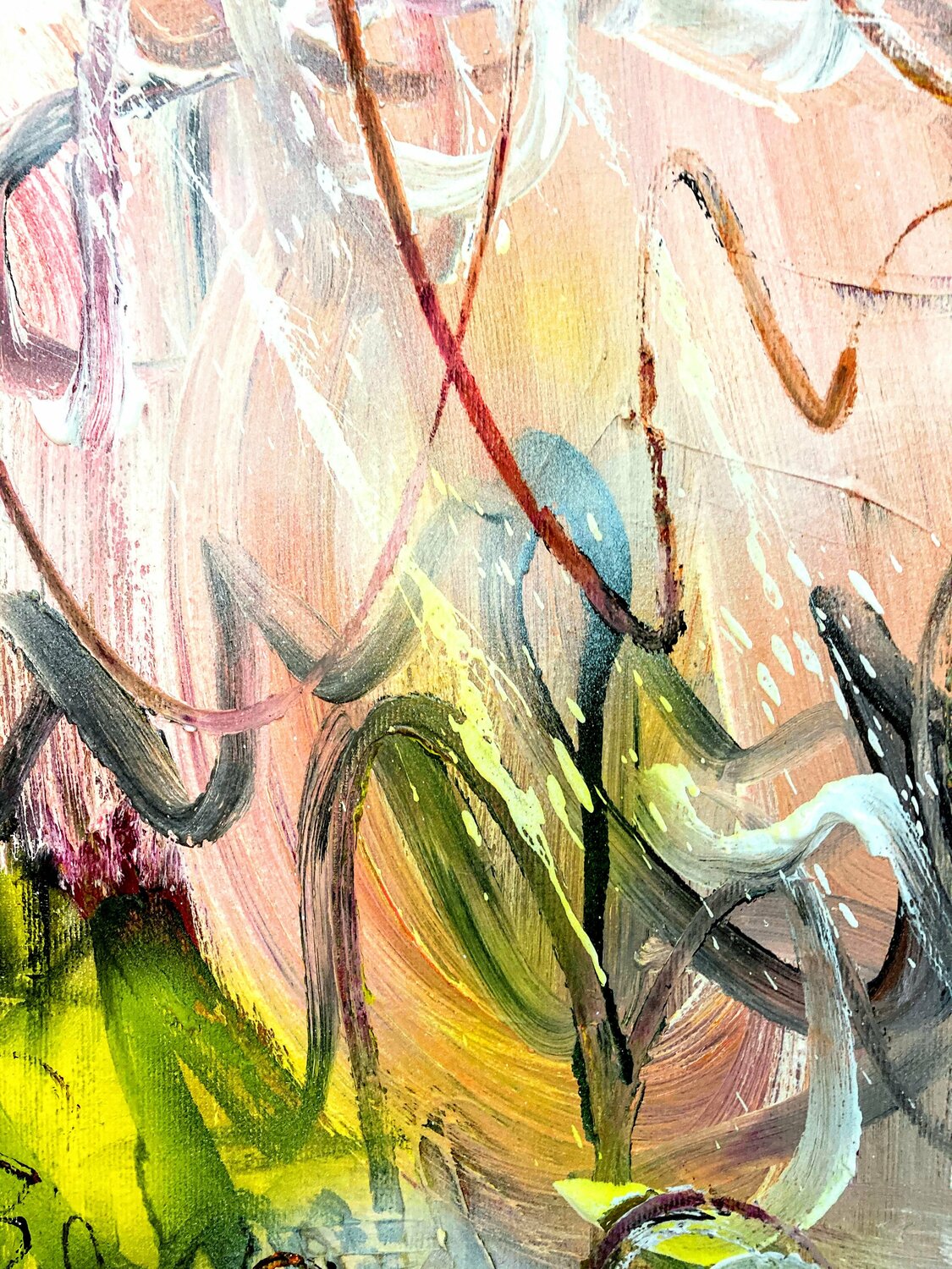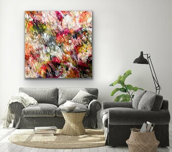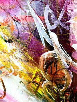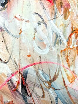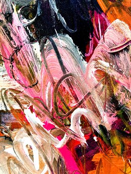Dieses Werk ist ein außergewöhnliches Werk der Künstlerin, denn sie hat dieses Mal kein florales, sondern ein komplett abstraktes Gemälde geschaffen. Und dennoch erkennt man ihre "Handschrift" auf den ersten Blick: ihre Vielschichtigkeit, ihre Farben, ihre weit ausladenden gestischen Pinselstriche und Markierungen, ob mit Kohle oder Marker - alles fügt sich zusammen zu einem einzigen freudvollen Crescendo! Im ersten Schritt hat die Künstlerin mit… schwarzer Acrylfarbe Linien gemalt, wild, ohne Anhaltspunkt, purer Ausdruck des inneren. Nach dem Trocknen wurden Farben angemischt, dunkle, ziemlich neutrale Acrylfarben, die flächig aufgetragen, hart abgegrenzt, oder ineinander verstrichen wurden. Mit Weiß hat die Künstlerin nass-in-nass die Flächen akzentuiert, geschrieben, mit dem Spachtel geritzt, Farbe abgekratzt, dann noch mit Kohle aktiv diagonal "geschrieben" und dabei in die Farbe gekratzt und die darunterliegende Farbe mitverteilt. Die letzte Schicht wurde mit Öl und Kohle gestaltet