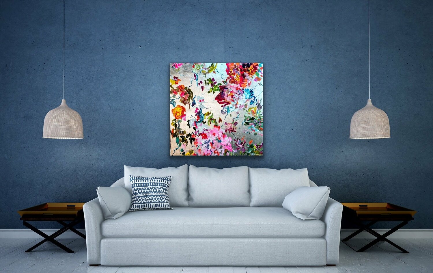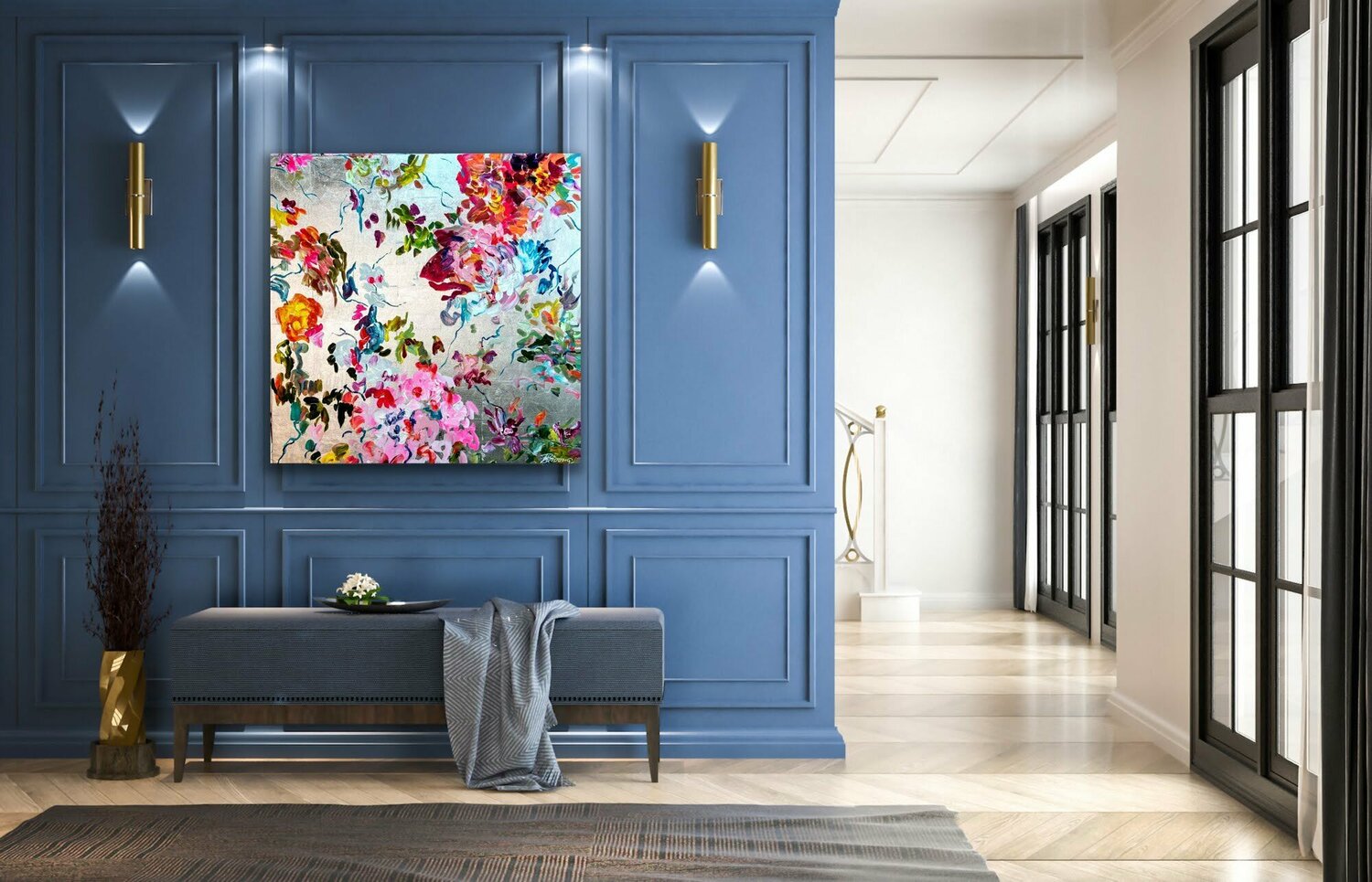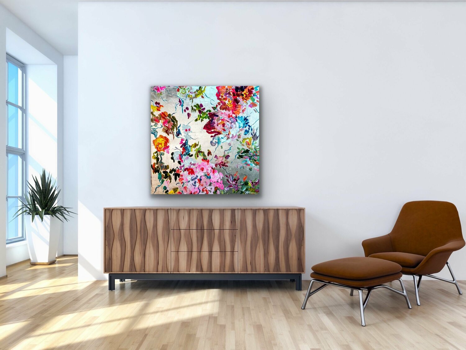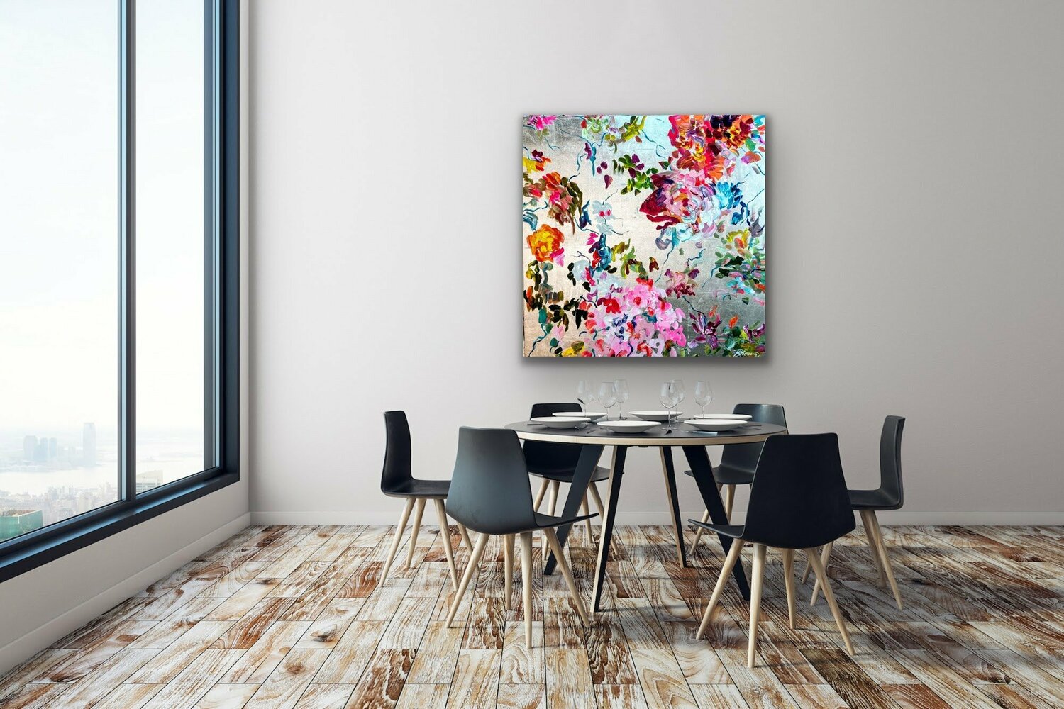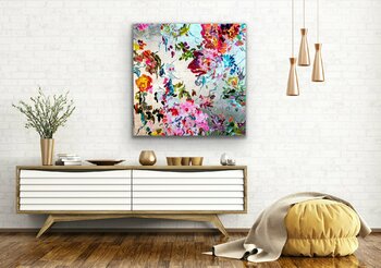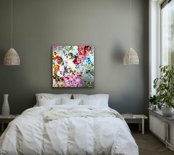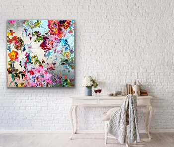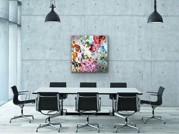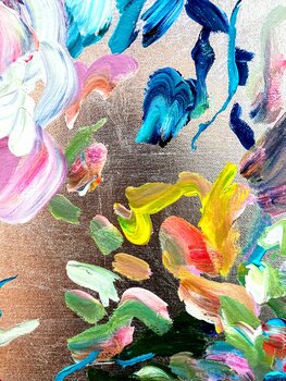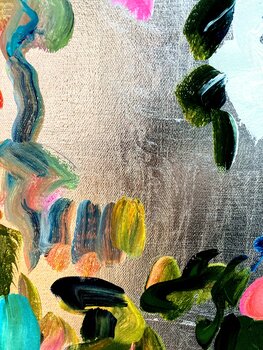 ig, sondern etwas gebrochen aussehen zu lassen, so dass sie zur Gesamtkomposition beiträgt. Die Herausforderung bei metallischen Untergründen ist, dass die Farbe sehr pastos aufgetragen werden muss, da sie sonst nicht ihre wirklich Farbqualität erreicht,… sondern fast durchscheinend erscheint. Die Künstlerin verwendet aber qualitativ hochwertige Acrylfarben in "Heavy Body"-Qualität, so dass sie die Farben ohne Probleme direkt mit hohem Duktus und Pigmentierung auftragen kann. Der silberne Hintergrund ist eine zusätzliche Herausforderung, weil er sehr kalt erscheint. Das Farbspiel, das die Künstlerin verwendet hat, ergibt aber eine harmonische warme und fröhliche Gesamtkomposition. Ein Bild voller Bewegung und Freude! Die abstrahierten Blüten tanzen geradezu über die silberne Leinwand!