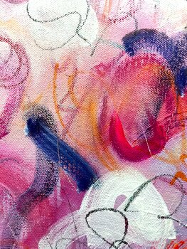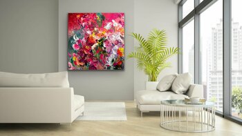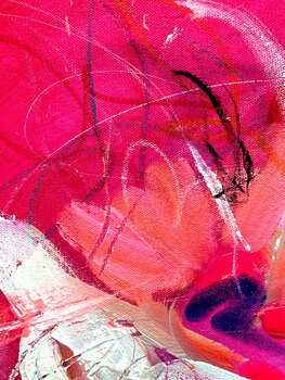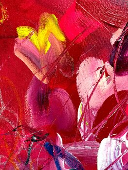 en hellen Pink drücken bestens das Thema der Liebe aus. Schwärmerei, Flirt, Werben, bis hin zu tiefer, inniger Liebe – alles ist in diesem ausdrucksstarken Werk der Künstlerin enthalten. Aus der Distanz sieht man einen wilden und wunderbaren Reigen von abstrakten Blumen, die sich umschlingen, sich umwerben, tändeln, niederschweben.… Erst aus der Distanz erschlie