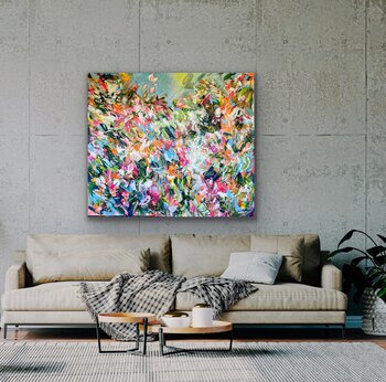 An einem freundlichen Sonntag Morgen saß die Künsterin auf ihrem Balkon . Es gab nur Blumen, Grün, Himmel, Sonne, Vogelgesang und Frieden - Glück pur! Wenn die Stadt noch nicht erwacht ist, keine Autotüren, die zuklappen, kein Hintergrundlärm, eine gute Tasse Tee oder Cappuccino in der Hand, den Vögeln lauschen, in den Farben der gerade erblühenden Blumen schwelgen und das Gefühl haben, das ist das beste Leben, das man lebt! Kennen Sie das auch?… Genau dieses Glückgefühl, diese Leichtigkeit und das Eins-Sein mit allem und ganz bei sich sein, wollte die Künstlerin mit diesem frischen und farbenfrohen Werk weitergeben. ACHTUNG - dieses Werk ist nicht aufgespannt!