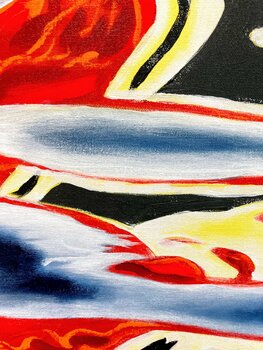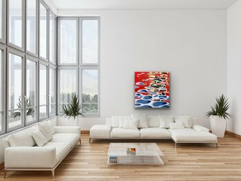Ein unkonventionelles Werk, das die Künstlerin hier geschaffen hat - zum einen fast fotorealistisch, zum anderen ganz und gar abstrakt. Teilweise klare, fast geometrisch abgegrenzte Flächen, teilweise sehr weiche Übergänge und Farbverläufe; starke Farbigkeit und fließende neutrale Töne, warm und kühl, eckig und oval. Genau diese Mischung der Gegensätze macht die Spannung des Bildes aus. Steht man direkt davor, erkennt man nur zusammenhanglose Flächen,… die auch durch die unterschiedliche Farbigkeit nicht im Einklang stehen. Erst ab einer gewissen Entfernung entsteht ein Gesamtbild: eine Spiegelung im Wasser. Ist es ein Haus, ein Gegenstand, ein Kleidungsstück - das ist in diesem Fall egal. Die künstlerin hat diese Momentaufnahme gewählt, um eben diese Einheit von gegenständlichem und total abstraktem in einem Werk zu vereinen. Dieses Bild macht in jeder Umgebung einen starken Eindruck, wie man auch in den In Situ-Fotos deutlich sehen kann.