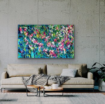 Dann gibt es dennoch eine Lösung, denn der Künstler arbeitet auch auf Kommission. Er kann stilistische Elemente, die Ihnen gefallen, in einem für Sie kreierten Werk einfließen lassen. Sie können dabei die Dimensionen bestimmen und wir verhandeln den Preis für Sie.