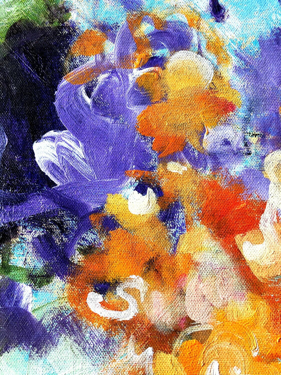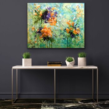 Dieses leichte, luftige Gemälde ist der Versuch, ein wenig Normalität, ein wenig Frühlingsgefühl zu empfinden und zu erzeugen. So leicht das Kunstwerk auch aussieht - die Künstlerin hat auch auf dieser Leinwand wieder mehrere Schichten aufgebracht, um diese verspielte und lichtdurchflutete Atmosphäre hervorzurufen. Zunächst wurden verschiedene Farbabstufungen in Monotype-Technik aufgebracht - von dunkleren zu helleren, mit wei